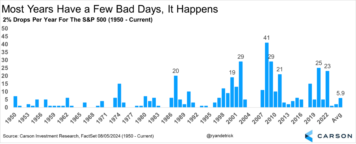 The third reason for the massive volatility is fears over the US economy slowing, potentially into a recession. At this time we don’t expect a recession, as this is more likely a growth scare, which aren’t uncommon, but it has many worried. Last week we saw disappointing manufacturing data and some high-profile earnings misses, and then Friday saw the monthly nonfarm payroll come in low at 114,000 jobs in July, versus a consensus expectation of 175,000, while the unemployment rate ticked up to 4.3%. Those aren’t horrible numbers, but they do suggest slowing economic growth.