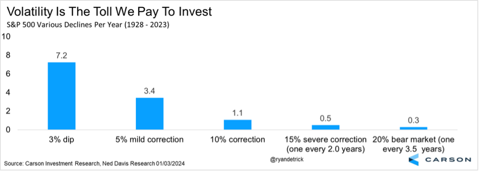 We like to say volatility is the toll we pay to invest and we are currently paying that toll, with the second 5% mild correction of the year for the S&P 500 taking place right now. But remember, on average, the S&P 500 sees more than three 5% mild corrections a year and one 10% correction a year. None of them are fun, but they are part of investing.