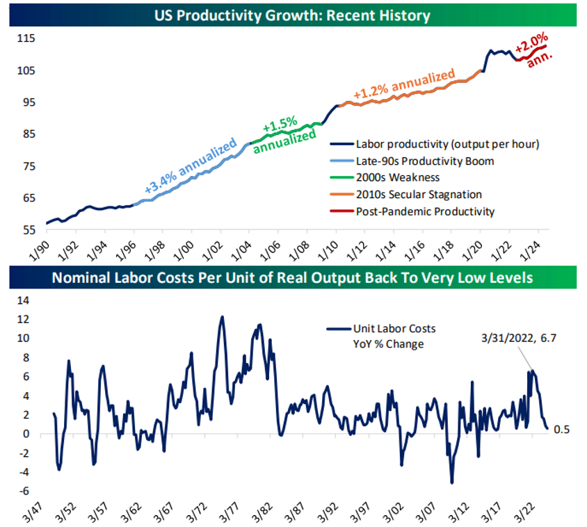 Things aren’t great, but they aren’t that bad either. Productivity in the second quarter came in much better than expected. We’ve been in the camp that better productivity would be coming and would support better economic growth. As a result of the strong productivity, unit labor costs have pulled back, putting a lid on overall inflation. (Workers are more cost efficient when they’re more productive.)