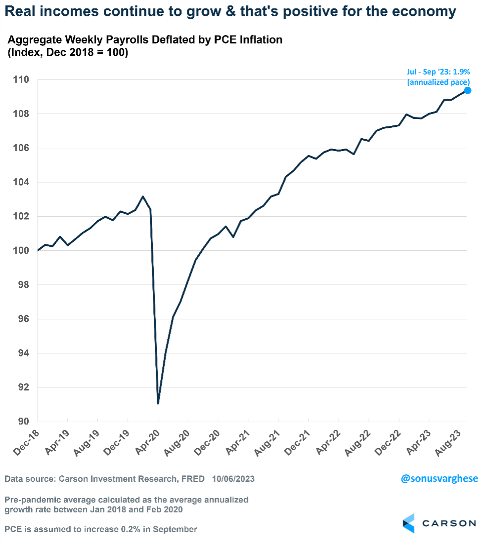 - Aggregate income is rising above the pace of inflation, and that’s powering the economy.