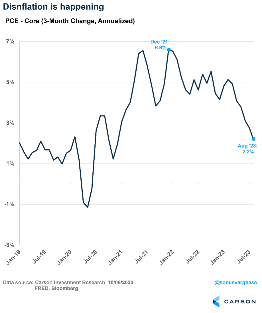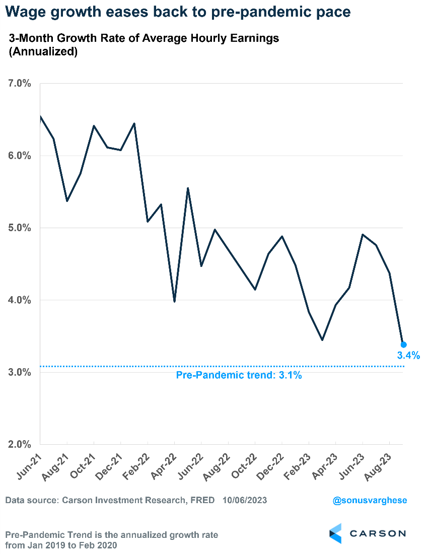 In short, the economy has strong momentum going into the fourth quarter, especially amid myriad concerns, all of which we have written about (strikes, student loan payment restart, government shutdown). The unemployment rate was steady at 3.8%, but that’s well below historical levels.