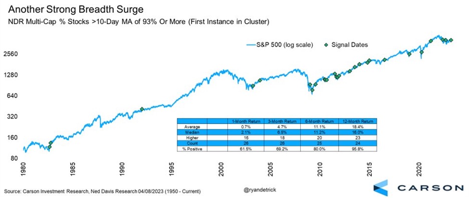 In fact, more than 93% of all stocks tracked by Ned Davis Research recently climbed above their 10-day moving averages. This rare sign of strength has led to higher prices for the S&P 500 23 out of 24 times one year later and an average return of 18.4% on average.