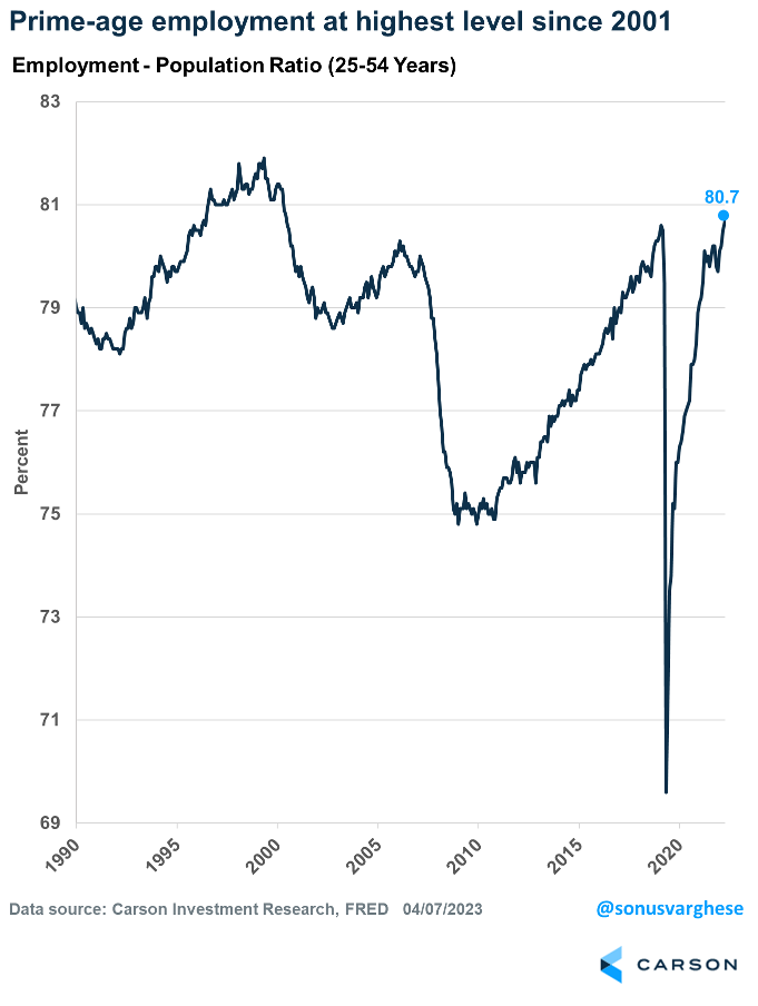 Perhaps the best indicator is the employment-population ratio for prime-age workers (25-55 years). In a sense the opposite of unemployment, this indicator measures employment for people in their prime working years as a percentage of the civilian working-age population. It also avoids issues related to an aging population and people who the BLS considers not part of the labor force for various reasons, such as lack of childcare. The measure rose to 80.7%, which is the highest level since 2001 and a sign that this is a strong labor market.