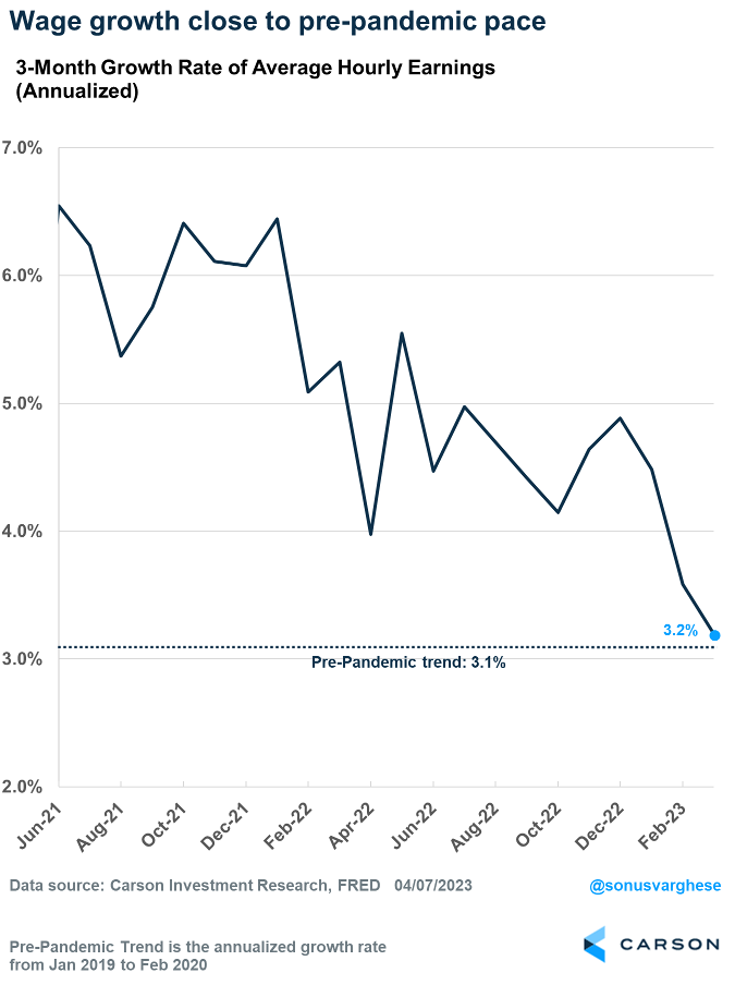 What’s most positive is the unemployment rate is near historic lows even as wage growth is decelerating. Over the past three months, average hourly earnings for private sector workers rose at an annualized pace of 3.2%, which is barely above pre-pandemic levels.