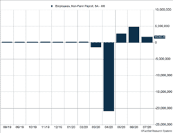 The U.S. economy added 1.8 million jobs last month, beating expectations of 1.5 million. The gains were lower than in previous months. June produced 4.8 million new jobs, but those were added when new virus cases were declining. This survey was done the third week of July when new COVID-19 cases were increasing and approaching nearly 75,000 per day.