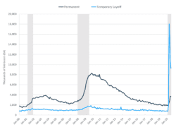 • Permanent job losses remained static, and temporary layoffs shrank to 56% as the service sector hired 1.4 million workers.