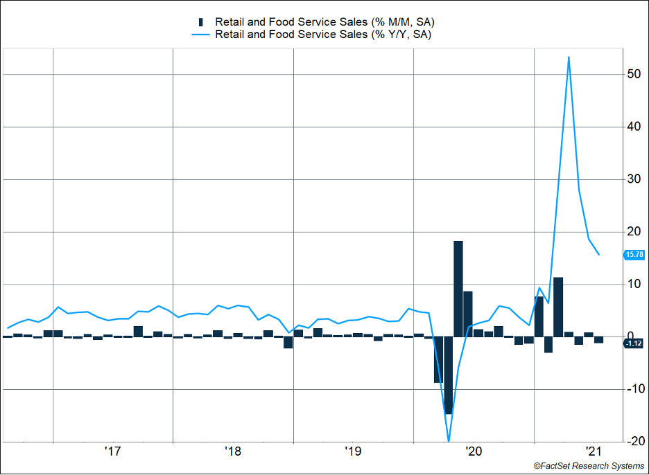 The U.S. economy continues to make a slightly bumpy transition from COVID-led stimulus to a self-sustained reopening. The bumpiness popped up again this week as retail sales missed expectations of -0.3% and instead declined 1.1% [Figure 1].