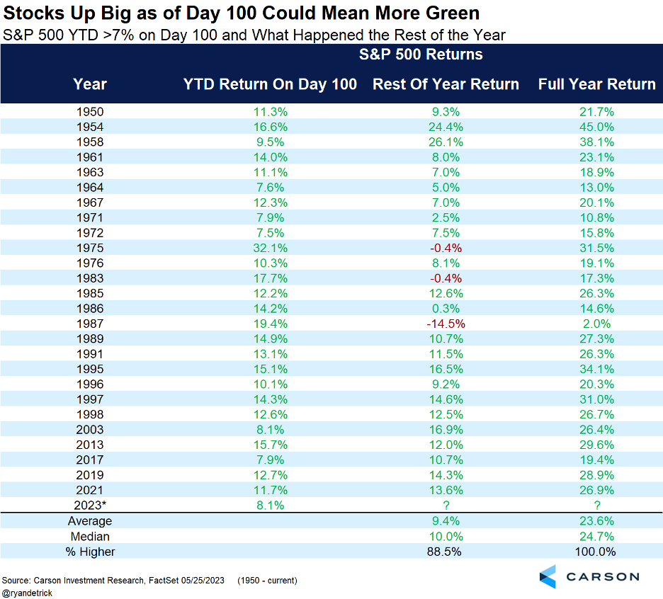 Last Thursday marked the 100th trading day of the year. The S&P 500 was up 8.1% for one of the better starts to a year. A good start tends to suggest continued higher prices. In fact, when stocks are up more than 7% as of day 100, the rest of the year has typically gained an incredible 89% of the time and added another 9.4% on average. So, it may not be as crazy as it sounds to remain overweight stocks, as we are, and to anticipate higher prices.