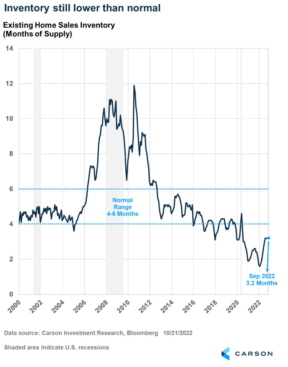 Normally, when demand falls, supply increases, which is what we saw during the 2007-2009 housing crash. That’s not happening now — at least, not yet. One measure of housing supply is “months-of-supply,” which is the number of months it will take to sell off the current inventory of homes if sales continue at the current pace. This metric is currently at 3.2 months. It hasn’t budged for three months now (July-September). It’s up from the record low of 1.6 months in January 2022 but still below what is considered normal, which is typically 4-6 months. Inventory matters for prices, as the next chart illustrates. Prices rise as inventory falls and, conversely, prices fall as inventory rises. Where we are on the chart (as of July) is unusual. Inventory is well below six months of supply and prices are falling. Something’s got to give — either home prices don’t fall significantly, or inventory rises.