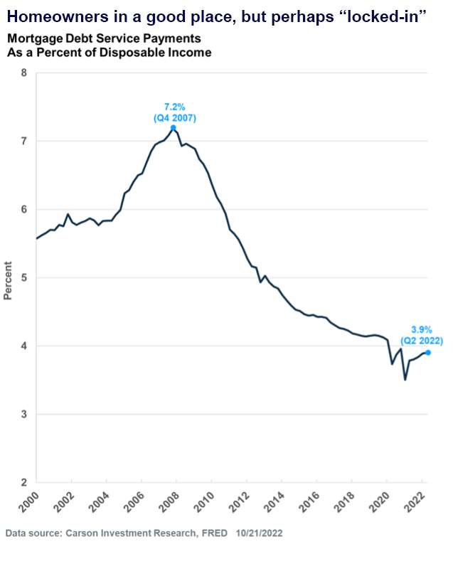 • Affordability is falling for new homebuyers, but existing homeowners are in a good place with respect to their mortgage payments, especially considering that many refinanced amid record low mortgage rates and also saw their incomes rise. Mortgage debt service payments as a percent of disposable income was at 3.9% as of the second quarter of 2022, only slightly higher than the record low of 3.5% from the first quarter of 2021.