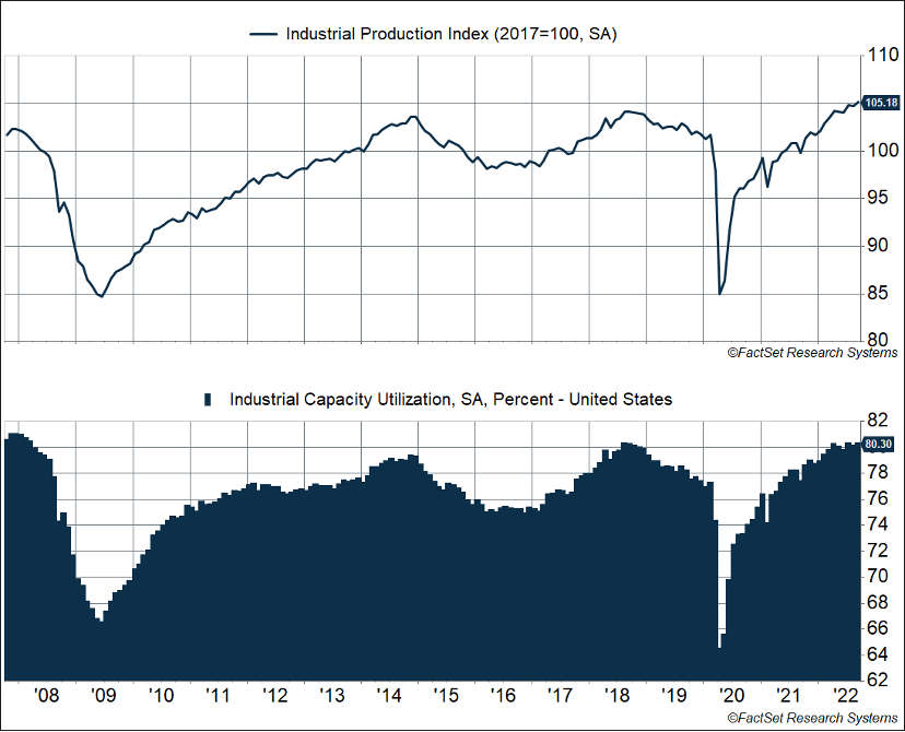 • Industrial production data show manufacturing output continues to run strong.