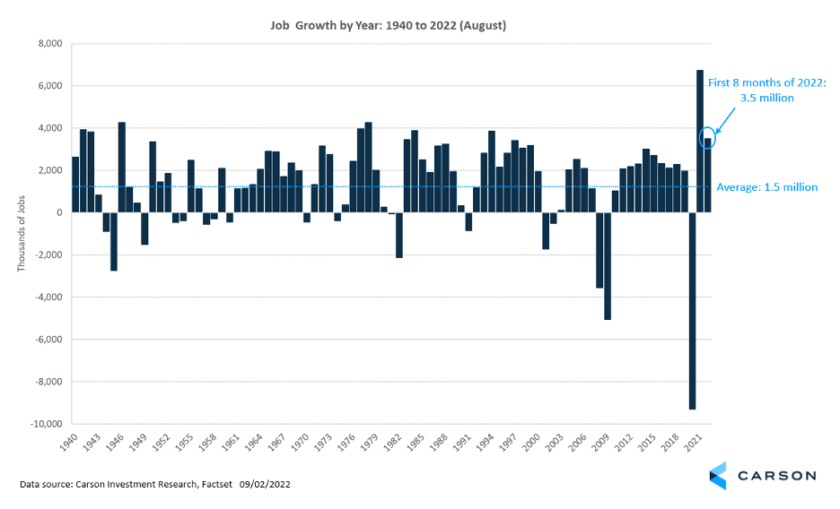 The economy created 315,000 jobs in August. Since these numbers can be revised, it’s more useful to look at the average over the last three months — job growth averaged 378,000 each month between June and August. The bigger picture is the economy has created 3.5 million jobs this year, and there are five months left to go. Average annual job growth since 1940 is about 1.5 million; 2.3 million when recessions are excluded. This is a very strong labor market.